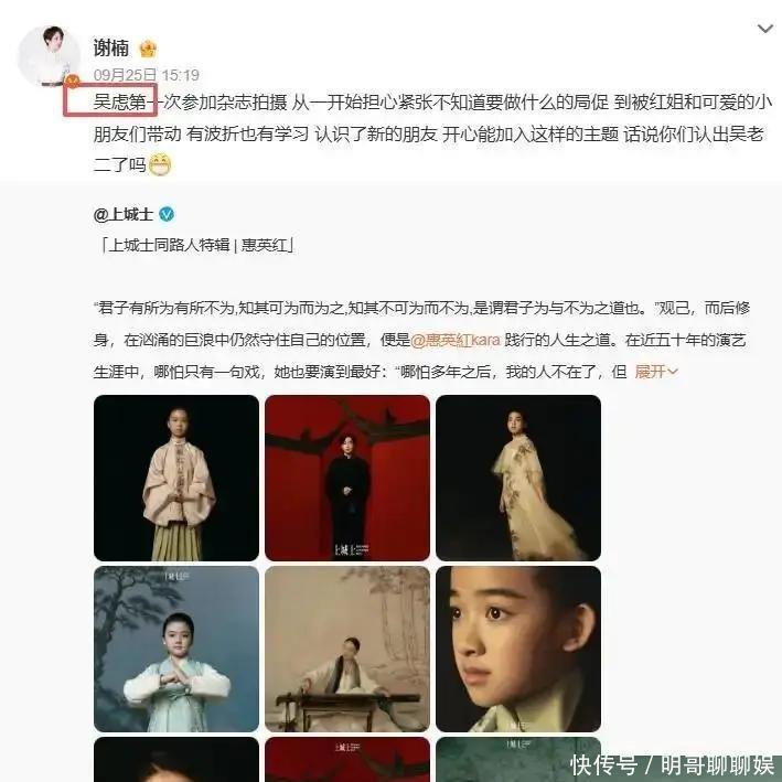 被骂得最狠的那几天,看到儿子的照片心里就舒服多了。9月25号那天,谢楠发了个消息,说她小儿子去拍杂志了。刚开始大家都没当回事,结果仔细一瞧,嘿,居然是正刊封面,和他一起拍的是惠英红,这商业价值可不算低啊。六岁娃跟老前辈一起拍照,气场一点儿没落下风,网友评论全是夸的,谢楠随后又发动态,这意图简直太清楚了。吴京这回没成为焦点,反倒是他儿子意外抢镜成了新看点,这效果,比花钱请人写宣传还管用。