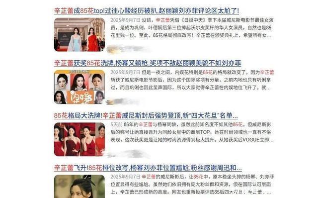 可从那以后,“洗牌”就没停过。2016年马思纯跟周冬雨凭《七月与安生》拿了金马影后,#马思纯晋升85花#话题阅读量破3亿,大家立马开始聊“85花实力梯队”;2 017年景甜靠《大唐荣耀》圈粉,那剧全网播放量超100亿,媒体直接把她归成“准85花”,半年里她的商业代言从5个涨到12个;2020年张雨绮上《乘风破浪的姐姐》火了,“敢爱敢恨”的人设出圈,“张雨绮挤入85花“又吵了一阵 ;2021年更热闹,童瑶凭《三十而已》拿白玉兰视后,张小斐靠《你好,李焕英》摘金鸡影后,那年被称作“85花晋升大年”。 2022年热依扎用《山海情》里的“李水花”拿了飞天奖视后,成了首个85后飞天视后,打破了“85花没正剧奖项”的说法;到2024年,辛芷蕾和唐嫣一获奖,刘亦菲、赵丽颖、杨幂的粉丝又因为“拉踩言论”控评大战。老实讲,这洗牌频率,比我换手机壳还勤,越洗越乱。